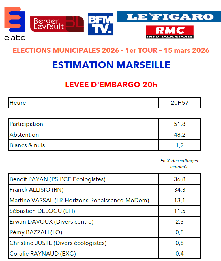 Télécharger le document ici : Estimations_ELABE_BERGERLEVRAULT_BFMTV_LEFIGARO_RMC_1ERTOUR_MARSEILLE_20H57