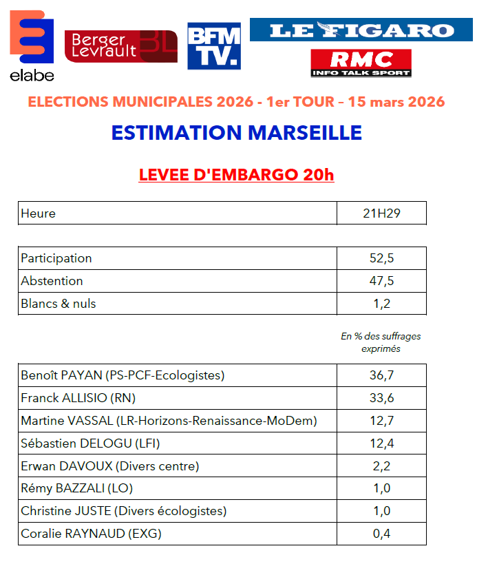 Télécharger le document ici : Estimations_ELABE_BERGERLEVRAULT_BFMTV_LEFIGARO_RMC_1ERTOUR_MARSEILLE_20H57