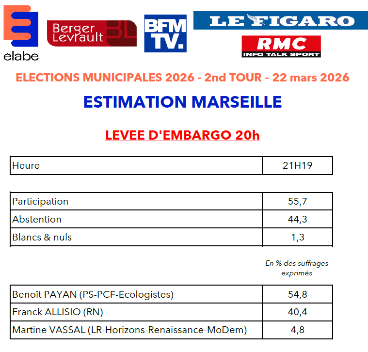 Télécharger le document ici : Estimations_ELABE_BERGERLEVRAULT_BFMTV_LEFIGARO_RMC_2NDTOUR_MARSEILLE_21H19